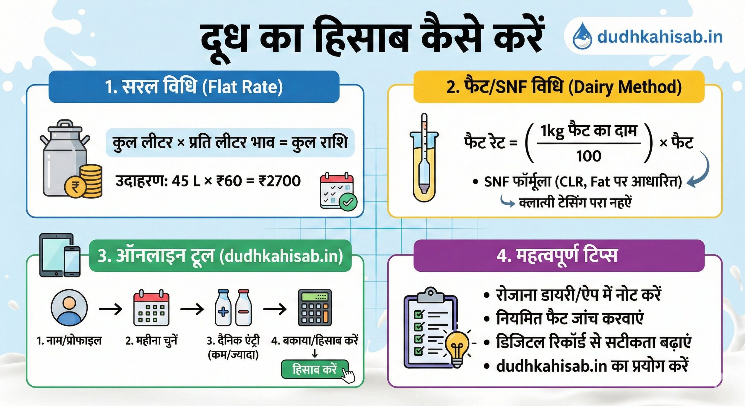 - फैट रेट निकालना: अगर 1 किलो फैट का दाम 800 रुपये है और दूध में 6.0 फैट है, तो 1 लीटर का भाव होगा: (800 / 100) \times 6.0 = 48 रुपये प्रति लीटर।